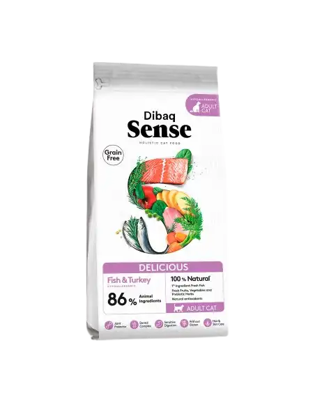 Dibaq Sense Delicious Pescado y Pavo Pienso para Gatos Adultos es un alimento premium para gatos formulado para satisfacer las necesidades nutricionales completas de los felinos adultos con una receta irresistible y de alta palatabilidad. Su composición grain free —libre de trigo, maíz y gluten— elimina los alérgenos más comunes de los piensos convencionales, reduce el riesgo de intolerancias y favorece una digestión ligera y eficiente en el día a día.