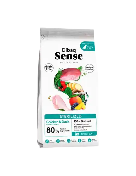 Dibaq Sense Pollo y Pato Pienso para Gatos Esterilizados es un alimento premium para gatos formulado especialmente para cubrir las necesidades nutricionales de los felinos que han pasado por una esterilización. Su receta grain free —libre de trigo, maíz y gluten— elimina los alérgenos más comunes de los piensos convencionales, reduce el riesgo de intolerancias y favorece una digestión ligera y eficiente desde el primer día.