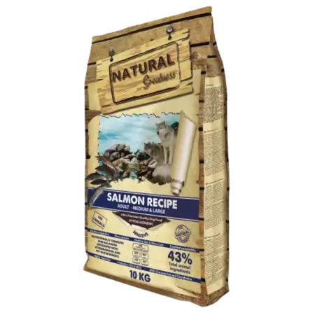 Natural Greatness Pienso Salmón es la elección perfecta para los dueños que buscan un pienso natural para perros elaborado con ingredientes de la máxima calidad. Formulado con salmón fresco como fuente de proteína principal, este producto ofrece todo lo que tu perro necesita para vivir con salud, energía y vitalidad.