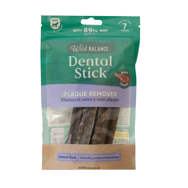 Stick Dental Wild Balance: el stick dental para perros 100% natural que mantiene los dientes limpios y sanos de forma deliciosa. Con un 89% de ternera deshidratada, algas marinas que previenen la placa y el sarro, y orégano que refresca el aliento, es el premio de higiene dental diario que tu perro necesita. Un stick para cada día de la semana, apto para perros de todas las edades. Saludable, seguro y con un irresistible sabor a carne.